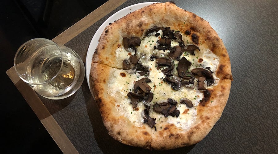 Mini Funghi pizza ($8) with house white wine ($6).