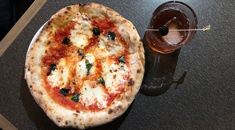 Mini Margherita pizza ($7) with the Classic Manhattan cocktail ($5).