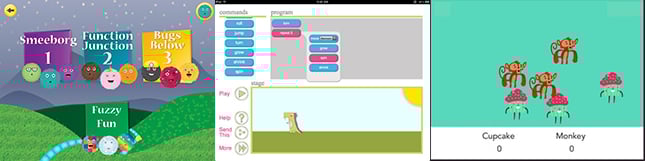 left to right: Kodable, Daisy the Dinosaur, a Hopscotch game