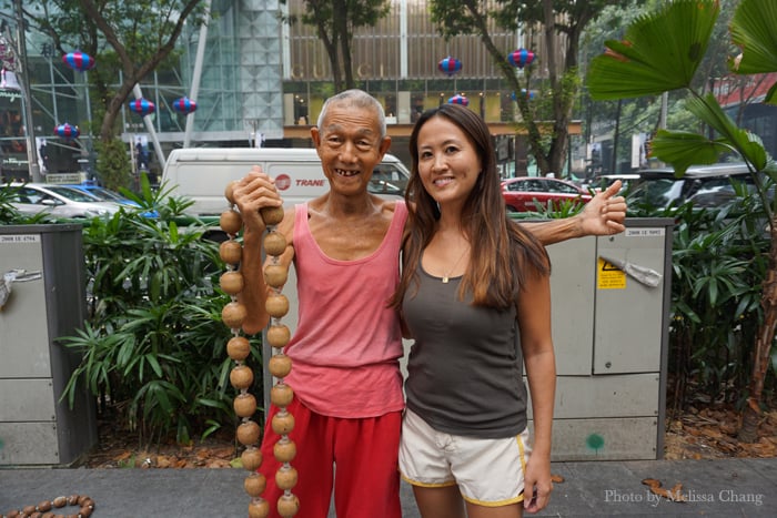 Along the way, we happened upon Mr. Oh Ow Kee, a busker who demos and sells “Woola wood ball chains,” which seem to be an extreme form of fitness practiced by ancient Chinese monks. The neat thing about this guy — who’s very famous in Singapore — is that he used to be a karang guni man until about 2000, when he discovered the chains and started using them to keep in shape. The balls are made by a furniture shop and his wife strings them together. This must be the secret to his long life.