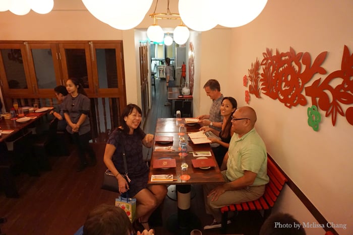 For our last dinner in Singapore, Celia and Viv suggested Ding Dong at 23 Ann Siang Rd. This is a very cool, hip area with popular bars, clubs and restaurants — much like our Chinatown, but exponentially cleaner. Ding Dong is a narrow restaurant, but goes three stories up, with the kitchen on the first floor so you can gawk at the crew when you first enter.