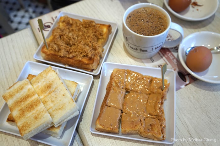 I love kaya, so can’t bring myself to eat other kinds of toasts, but here they had thick-cut toasts spread with peanut butter or (at top) pork floss. These are all popular toasts that are eaten in Singapore for breakfast or a snack. The peanut butter is pretty straightforward, but the pork floss is more savory. I like it, but I can see where it might be a bit of an acquired taste.