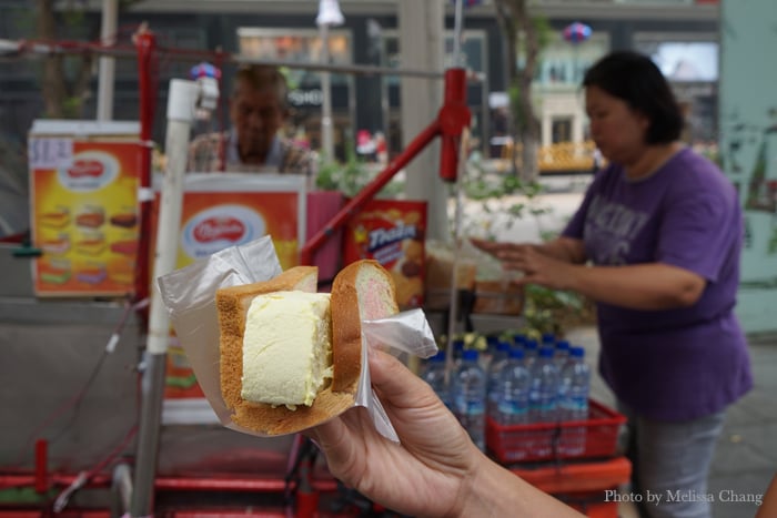 One last ice cream sandwich on rainbow bread before leaving Singapore … with durian ice cream, of course!