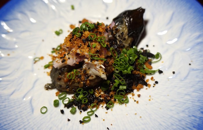 Burnt nasu (eggplant) with crab and crispy shrimp. Many of these plates are really small, but they do fill you eventually.