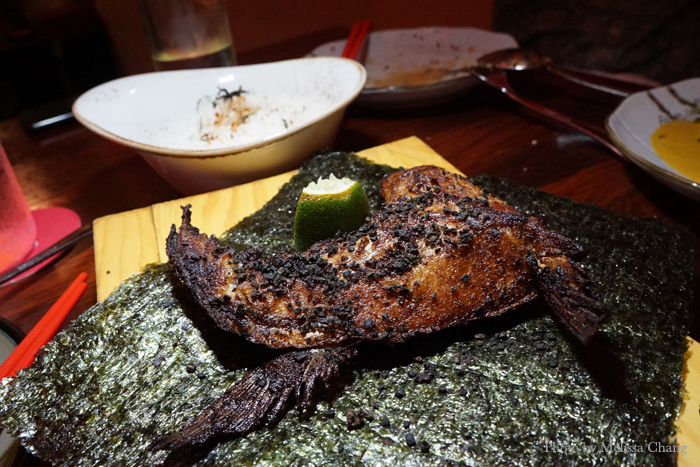 Roasted black miso kingfish wing. This is served on a sheet of nori, and you get a bowl of rice.