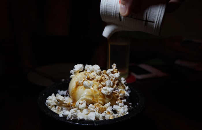 Our favorite dessert of the night: Cendol — pronounced “chen-doll” — is Southeast Asian shave ice served with syrup, ice cream, and other condiments. This one was topped with corn ice cream, popcorn, and Malacca honey. Amazing! Someone in Hawaii should do this. Wink.