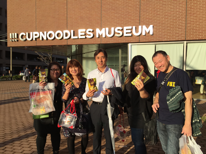 Outside the Cup Noodles Museum with their Hawaiian Host fruit bites (from left) Amy Setsuko Hanashiro, Sayoko Takeuchi, Inoue san, Deanne Matsushima (in a photo!) and Kurt Saito. Amy, Deanne and Kurt are all originally from Hawaii.