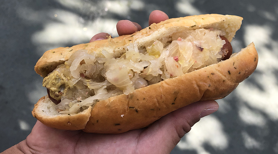 Bratwurst sausage is loaded with hickory-smoked bacon sauerkraut and served in a super soft garlic-and-herb brioche bun.