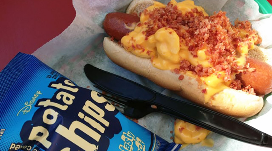 Why it’s magical: You probably won’t recognize this spot by its official Refreshment Corner name. Instead, look for the sign that says “Corner Café” almost at the end of Main Street, U.S.A., and you’ll see it. This basket contains your traditional hot dog gone cheesy. It’s loaded with creamy mac ‘n cheese and bacon bits, and comes with your choice of sliced apples or a bag of chips. Talk about dog-gone deeeeeelicious