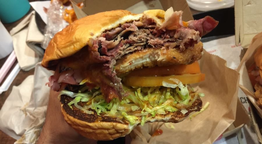 On to da next one. I studied da Big Kahuna Sandwich ($9.99) and it made me laugh. Cuz it made me think of when you go to one plate lunch place and you dunno what for order. Lotta times when you no can decide, you just get da mix plate which get little bit of everything, right? This sandwich is kinda li’dat. Da ting get chicken, pig AND cow too. When you eat this, you eating da whole farm, brah.