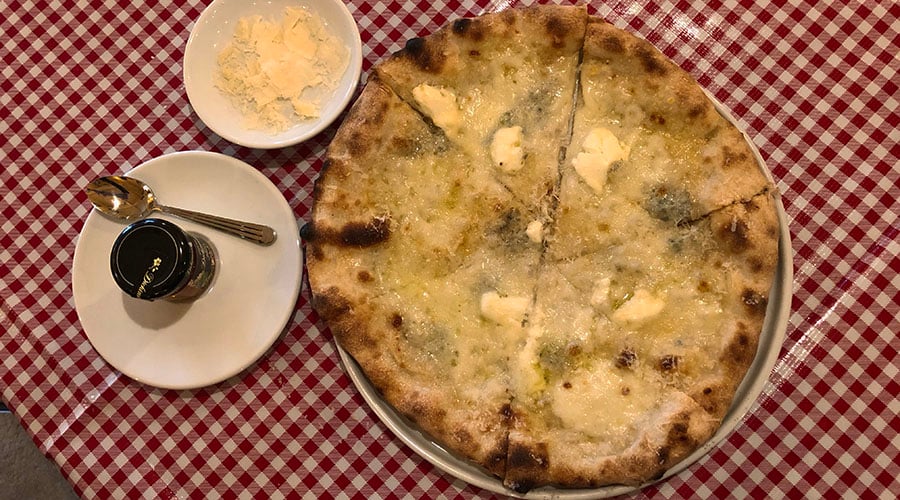 The pizza dough is made fresh at the restaurant. If you’ve never had a cheesy pizza drizzled with honey, it’s the ultimate sweet-and-savory balance. The best way to eat this is to hold off on the honey, take a bite and enjoy the umami flavors, then drizzle honey over the rest of the slice.