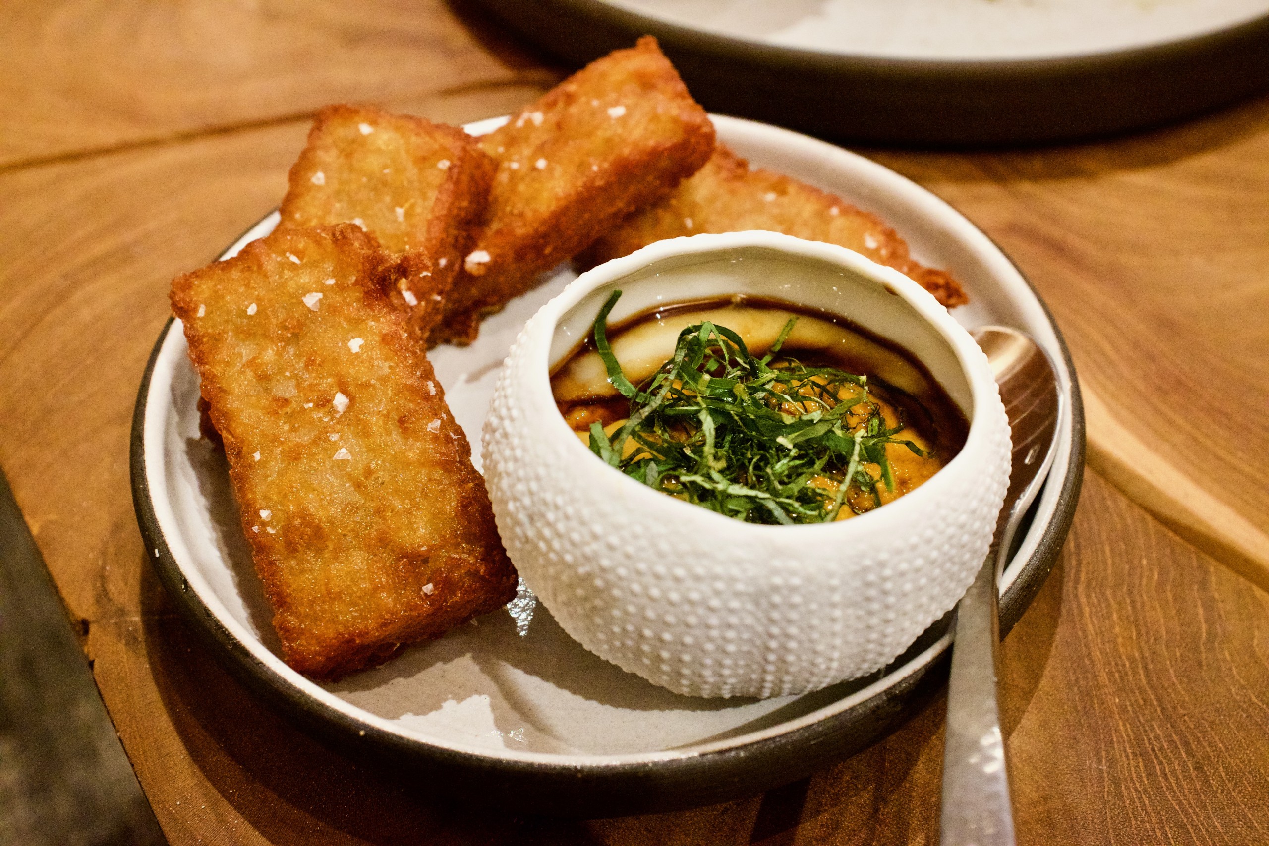 And yet, the effervescence in the drinks matches a lot of the a la carte food menu, such as the Kitsune alongside kusshi oysters with a calamansi vinaigrette. The citrus in the drinks is echoed in the citrus-marinated salmon tartare, like fancy chips and dip with light-as-air rice chips. And the fizzy drinks also help cut the richness of many of the fried foods, our favorite of which were the potato croquettes served with a little pot of potato cream topped with uni. It was simultaneously luxe while also reminiscent of cheesy McDonald’s hash browns. We ordered all of the food items on the opening menu—with each individual dish, chef Ki Chung does an excellent job of remaking bar snacks, as in an upscale take on a Bloomin’ Onion and a grilled cheese, but taken altogether, the theme of fried thing plus dip becomes wearying. And what does it say when after all that effervescence, our favorite cocktail was the Maze Old Fashioned, the strongest drink on the menu and warmed with bourbon, vanilla and demerara sugar?