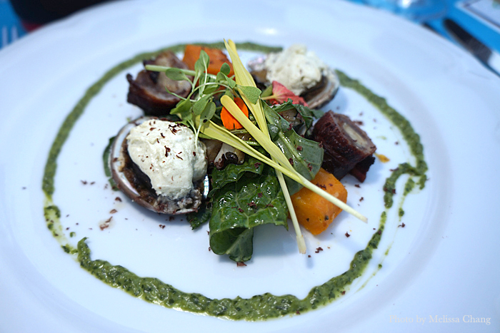 Smoked Kona abalone with kabocha, Surfing Goat Dairy goat cheese, Okinawan spinach and herbs, yuzu and Old Hawaiian Factory chocolate.