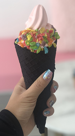Fruity Pebbles is a good choice if you don’t like your ice cream too sweet. The cereal-inspired flavor is mild and the color matches the shop’s whimsical pink decor. Cereal toppings like Fruity Pebbles and Trix enhance the soft serve’s flavor and come recommended by the staff.