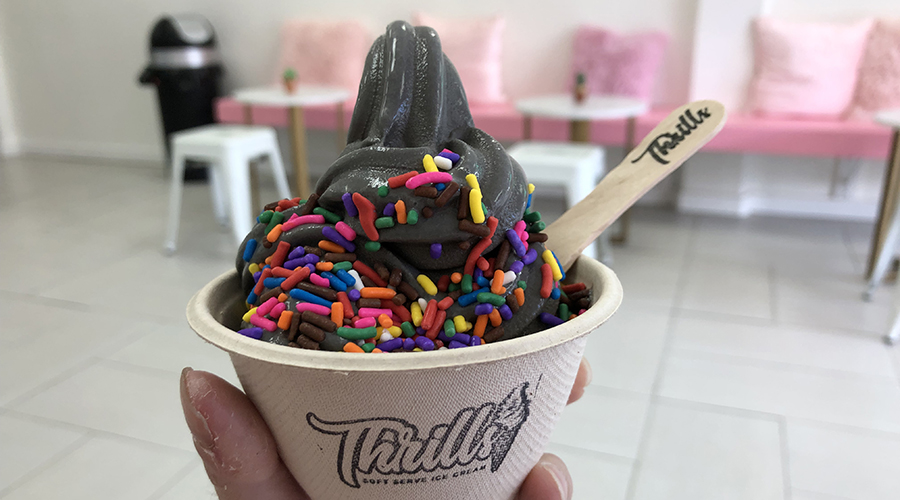 The menu is small with just five soft serve options in either a cup ($5) or a cone ($6). Additionally, for one week every month, Thrills will feature a rotating limited flavor to change things up and give its regular customers a chance to try something new.