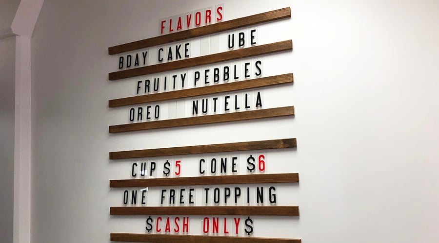 Unfortunately, you can’t swirl two flavors together just yet so you’ll have to decide on one or eat multiple. Charcoal cones are available for $1 as are additional toppings (beyond the first) like toasted marshmallows, sprinkles and cereal. Oh and be prepared: Thrills accepts all forms of payment as long it’s in cash.