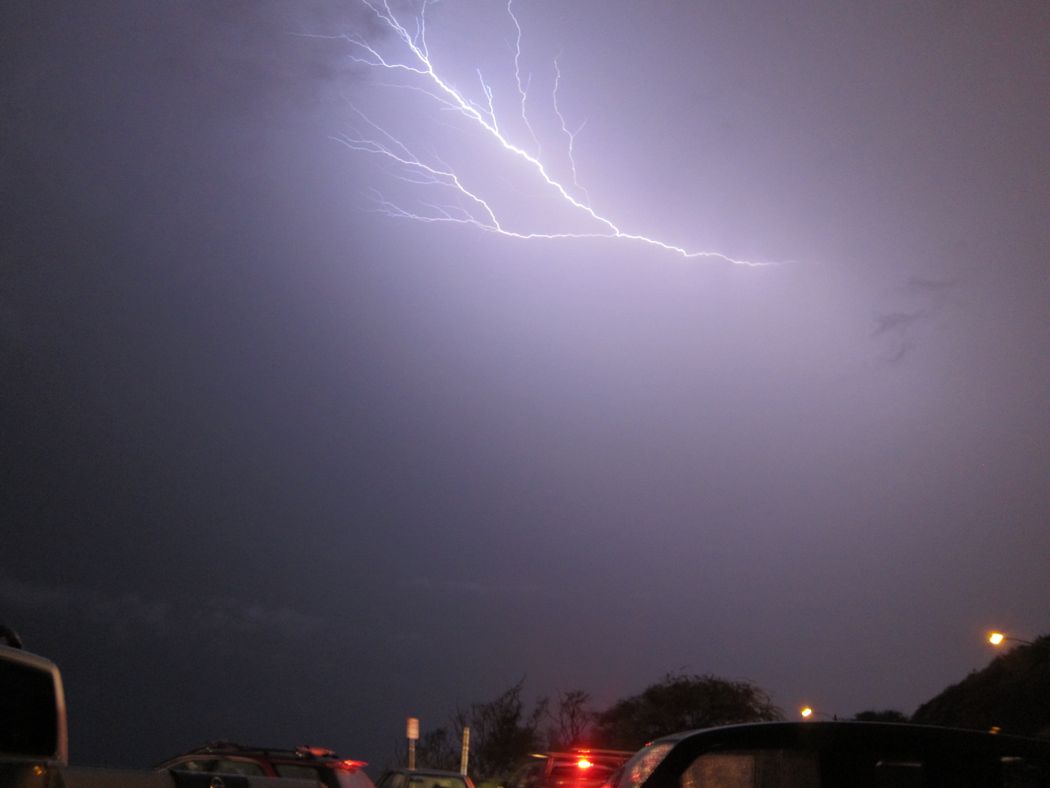 We first went to Kuliouou, where the heavy clouds were too thick to see bolts. So we drove west, ending at Diamond Head lookout, where I snapped these shots. (To the right, the top photo was before, the second was after a large lightning episode.)