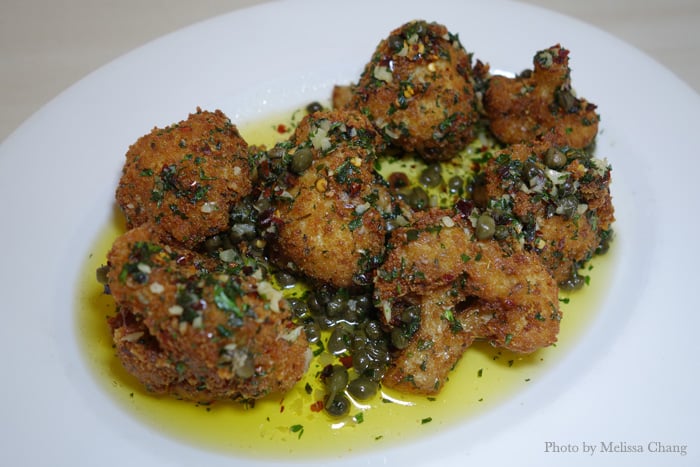 The big surprise of the night — another favorite — was the Sicilian cauliflower. At first we thought it was chicken karaage! These savory bites were tender (not mushy) and not greasy at all, despite the parmesan-bread crumb crust and the butter and browned garlic. The capers really pulled everything together. I can’t even describe how good these are — you’ll have to try it yourself. Robert Kukonu, who was sitting next to me, took some of the capers and put them on his lobster gnocchi, which was also a brilliant move.