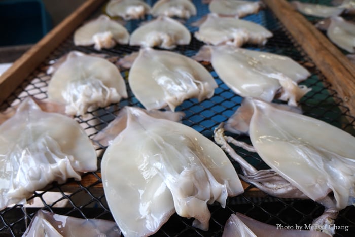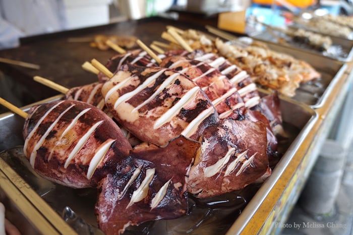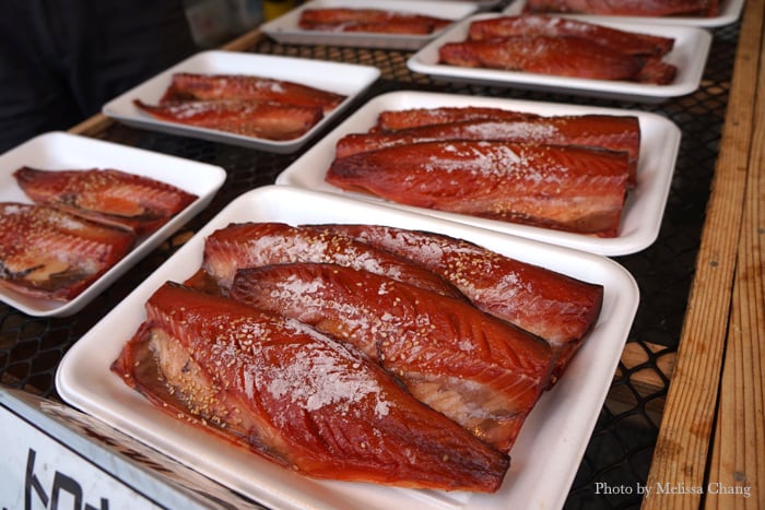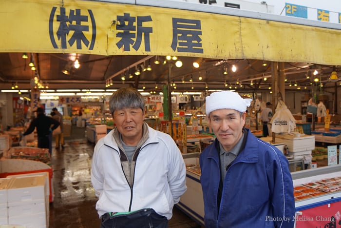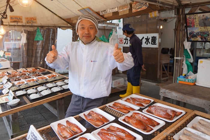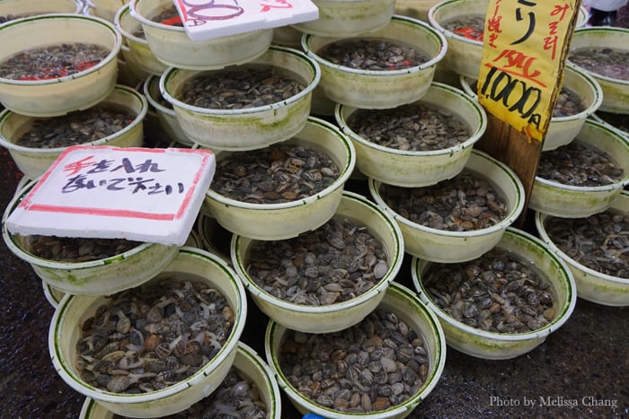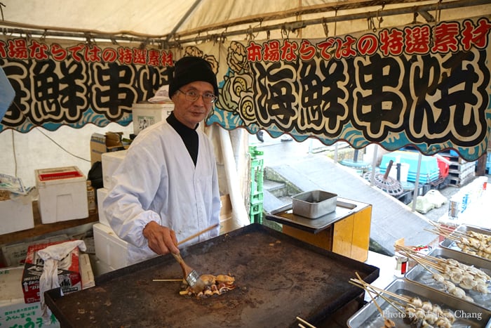 This guy sells all kinds of dried, salted fish — and it’s super good! For dried fish, it’s very moist, and very tasty. It’s not fishy at all, and we considered buying some to go. We just weren’t sure about the perishability. But the guy was really generous with samples, which was kind of cool. You’d never see that at Tsukiji. Actually, quite a few of the vendors had trays of samples out at the front of their stalls, unattended, while they were busy doing something else. (And they were all good!)