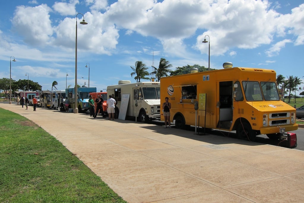 So on Tuesday I count 11 food trucks and Inferno’s Pizza lining the Ilalo and Cooke street sides of the grassy block. One vendor tells me there were 14 last week (commitments, engine trouble and other issues keep the number fluctuating). See here? That’s